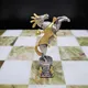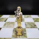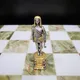Поле шахмат выполнено из редкого и благородного оникса, сочетающего в себе оттенки белого и глубокого зеленого. Доска и фигуры, отлитые из бронзы, вручную расписаны серебром и золотом, придавая им неповторимый блеск и роскошь. Каждый элемент выполнен с исключительным вниманием к деталям, что делает эти шахматы настоящим шедевром.
